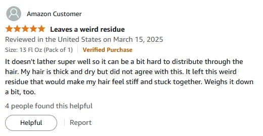 This shampoo lathered poorly, making it hard to spread through my thick, dry hair. It left a stiff, sticky residue that weighed my hair down and made strands clump together unpleasantly.