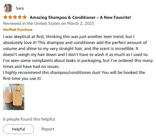I was skeptical at first, thinking this was just another teen trend, but I absolutely love it! This shampoo and conditioner add the perfect amount of volume and shine to my very straight hair, and the scent is incredible. It doesn’t weigh my hair down and I don’t have to wash it as much as I used to.