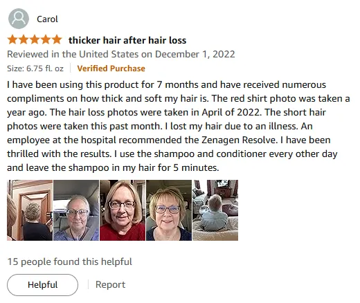 I have been using this product for 7 months and have received numerous compliments on how thick and soft my hair is. The red shirt photo was taken a year ago. The hair loss photos were taken in April of 2022. The short hair photos were taken this past month. I lost my hair due to an illness. An employee at the hospital recommended the Zenagen Resolve. I have been thrilled with the results. I use the shampoo and conditioner every other day and leave the shampoo in my hair for 5 minutes.